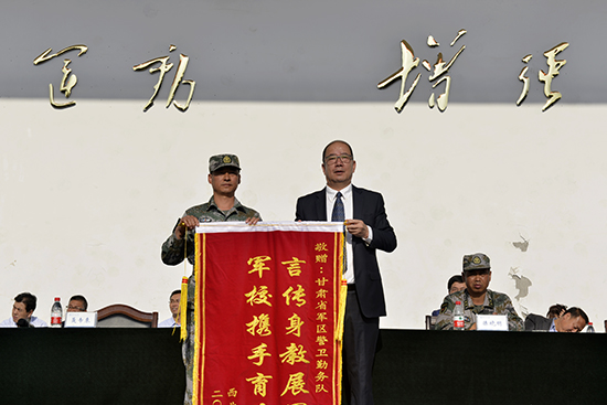 汇报表演结束后,万明钢向甘肃省军区警卫勤务队赠送锦旗并讲话。他代表学校向圆满完成各项军训任务的2017级本科生表示祝贺,向承训部队官兵对学校军训工作的关怀与支持表示感谢。万明钢希望同学们把军训中培养起来的组织纪律观念和团结协作精神发扬光大,把自己培养成为具有系统思维、批判性创新思维和信息化应用能力的大学生;把军训中培养起来的力争上游、顽强拼搏的精神发扬光大,把自己培养成为追求卓越,具有丰富学识和人文情怀的大学生;把军训中培养起来的集体主义和爱国热忱发扬光大,把自己培养成为敢于担当,具有国际视野、过硬本领的大学生。