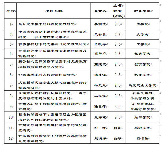 近日,2017年度甘肃省哲学社会科学规划项目立项结果公布,西北师大共获准12项。其中,一般项目10项,资助经费每项2.5万元,自筹项目2项。