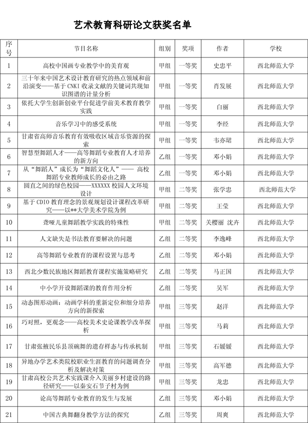 西北师大在活动中获得66项奖励,充分展示了学校艺术教育的丰硕成果,获奖等次和获奖数量为历届最高。其中,艺术表演节目类获一等奖7项、二等奖7项、三等奖3项;艺术作品类获一等奖6项、二等奖7项、三等奖12项;艺术实践工作坊获三等奖1项;艺术教育科研论文获一等奖7项、二等奖7项、三等奖7项;大学生艺术展演活动校长风采奖获奖2项;学校获“优秀组织奖”。