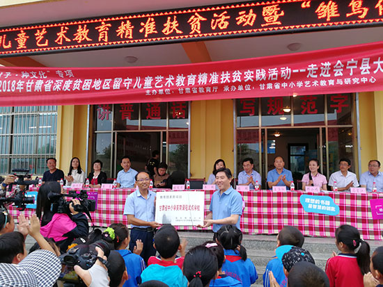 启动仪式上,张俊宗为大沟镇中心小学授牌“甘肃省中小学美育课程试点学校”,中国青年报社为大沟镇中心小学捐赠图书3000余册、教具200余套,建立了“雏鸟伴飞爱心图书馆”。张俊宗在讲话中说,西北师大是一所以拓荒教育为特色的百年老校,特别是西迁兰州以来,以发展甘肃及西北教育事业为己任,在致力于培养一批批人民教师的同时,广泛深入的开展了丰富多彩的教育服务活动。在新的伟大时代,为积极响应党中央关于加强中小学美育教育的号召,服务精准扶贫事业,培育了“爱在远山”全省贫困地区艺术教育精准扶贫活动,在会宁、东乡、积石山等五个深度贫困地区同时开展活动,旨在把美的精神、美的向往,根植于孩子们的心灵深处,为他们对美好生活的向往插上放飞的翅膀。活动受到了省委、省政府的高度重视,得到了社会各界的高度关注,对助推正在进行的精准扶贫伟大事业和乡村振兴伟大战略产生了重要的影响。