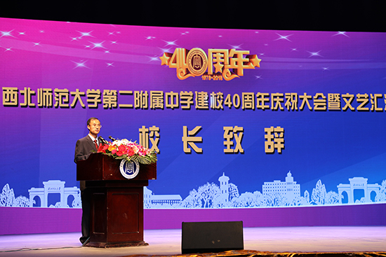 西北师大二附中校长窦继红在讲话中介绍了学校历史沿革以及发展状况。他说,西北师大二附中创建于1978年,我国著名教育家、原西北师范学院院长李秉德先生担任首任校长。四十年来,二附中充分利用地处大学校园育人优势,秉承“严、勤、实、恒”的校训精神,以“引领甘肃基础教育发展、西部一流、全国有一定影响的精品学校”为办学目标,办学成绩显著。四十年岁月峥嵘,几代人躬耕树蕙。校庆是二附中办学品质的精彩展示,是二附中人对历史的尊重和对未来的庄严承诺。所有二附中人将在庆祝活动中收获成长的喜悦和精神的动力,前进路上一定披荆斩棘,再创佳绩。