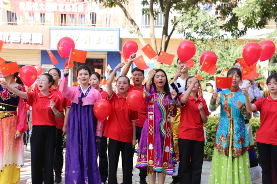 上午10时,西北师大本科生居住的兰天公寓,朝阳在金秋的煦风里蓬勃而出,随着小提琴悠扬的音乐声,26名舞蹈学院青年学子摇曳着鲜艳的五星红旗和花束从公寓花坛中走出,青春活力的表演让现场瞬间一片沸腾,聚集在公寓广场上的同学们齐唱《今天是你的生日,我的中国》《我和我的祖国》《义勇军进行曲》,在“快闪”中为伟大的祖国唱响青春的赞歌。