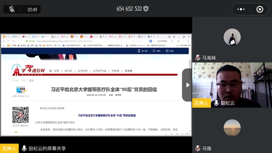 近日,西北师大依托网络平台,创新形式,运用大学生喜闻乐见的新媒体形式,组织开展了线上主题党日活动,专题学习习近平总书记给北京大学援鄂医疗队全体“90后”党员的回信精神。