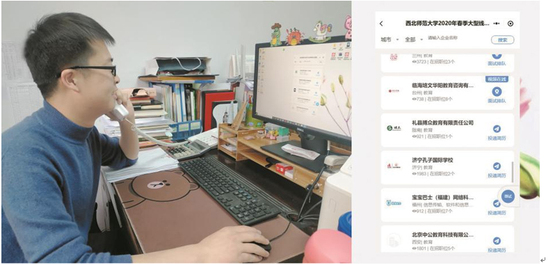 双选会期间,西北师大就业指导教师即时与用人单位进行技术咨询,学院辅导员通过线上方式指导毕业生求职应聘。