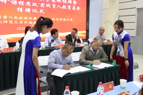 朗建贞与西北师大社会合作服务处负责人签订“课程思政”实践育人教育基金协议,对“课程思政”实践育人志愿服务中表现突出的王世莹、张丽霞、马文霞、陈雨秋、崔泽欣五位同学进行了褒奖;黄晨对应急外语人才在疫情防控中的重要性进行了说明,希望外国语学院继续发挥专业优势,培养更多优秀的人才;国际合作交流处负责人对甘肃省人民政府外事办公室、欧朗语通(北京)国际翻译有限公司以及社会各界对基地的支持关注致以诚挚的谢意。