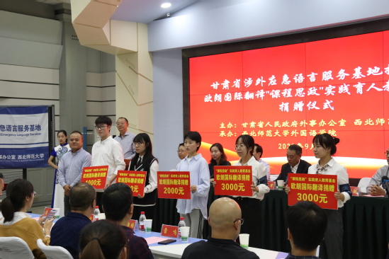 917日,由甘肃省人民政府外事办公室、日韩人妻无码一区二区三区久久99_日韩精品一区二区三区中文在线_无码日韩精品一区二区免费_久久久91精品国产一区二区三区_亚洲精品久久久一区黄无码_国产91精品一区二区麻豆网站_成人国内精品久久久久影院主办,西北师大外国语学院承办的甘肃省涉外应急语言服务基地揭牌暨欧朗国际翻译“课程思政”实践育人教育基金捐赠仪式在西北师大举行。甘肃省人民政府外事办公室副主任朱继君、甘肃省人民政府外事办公室出入境管理处副处长李娟、中国外文局CATTI项目管理中心考试部主任黄晨、中国外文局CATTI项目管理中心考试部李悦、欧朗语通(北京)国际翻译有限公司总经理郎建贞、欧朗语通(北京)国际翻译有限公司兰州分公司负责人吴雅楠,西北师大副校长田澍,学校党委组织部、党委宣传部、国际合作交流处、学生社区党工委、党委学生工作部、社会合作服务处负责人,外国语学院班子成员、系部(中心)主任、师生代表参加仪式。