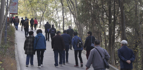 登山途中,离退休教职工观看沿途秋景,畅谈近年来学校发生巨大的变化和退休后的生活情况,欢声笑语此起彼伏。