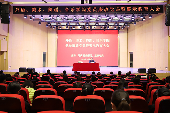 10月27日,外国语学院、美术学院、舞蹈学院、音乐学院在音乐厅联合举行党风廉政教育宣传月教育活动,邀请纪委书记、监察专员马庆为全体教工讲授《强化理想信念 严守纪律底线》的廉政党课报告。