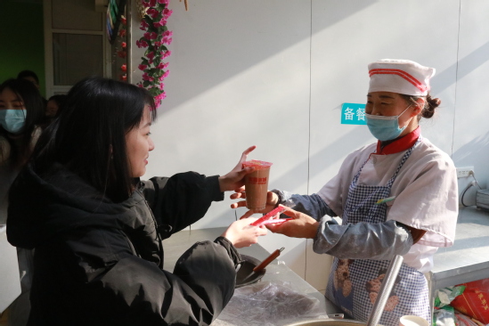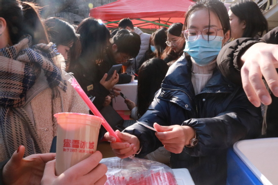 1219日,西北师大学生餐饮文化中心开展助力师大学子考试季福利活动。在当天的活动中,由字节跳动公司赞助的一吨奶茶通过现场随机抽奖的形式免费发放给学校师生。抽中1000杯“幸运锦鲤”大奖的我校数学与统计学院2018级学生李曦将所中奖品全部送给学生公寓管理员、学校门卫、餐厅厨师、保洁人员及参加活动的同学。“叔叔阿姨们辛苦了,希望这一吨奶茶的温暖可以传递到更多人心里,让更多的师大人分享这个冬天学校送上的温暖和甜蜜!”李曦说。