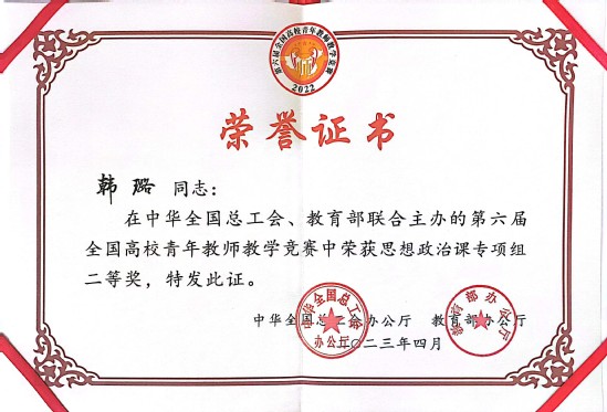 4月24日,由中华全国总工会、教育部联合主办的第六届全国高校青年教师教学竞赛决赛结果出炉。西北师大马克思主义学院韩璐荣获思想政治课专项组二等奖(第六名)。
