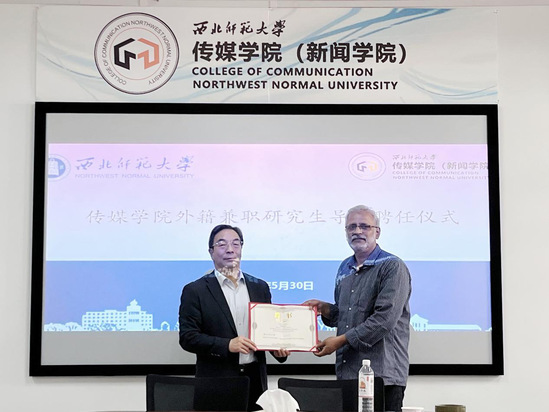聘任仪式上,西北师大国际合作交流处负责人为Shri Prakash教授颁发聘书,并对印度独立制片人Shri Prakash教授进行介绍。Shri Prakash教授在电影创作实践方面成就突出,曾荣获美国国际铀电影节终身成就奖,美国雷鸟电影节最佳影片奖,美国地球视觉电影节特别评审团提名奖,柏林第十八届黑人国际电影节最佳影片奖等,影视代表作品有《心火》《我要活下去》《再次抗争》《为谁辩护》等。