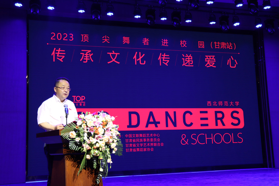 贾宁在致辞中表示,西北师大是全国最早设置艺术类学科的五所师范院校之一,是甘肃省最先开设舞蹈本科专业的院校,艺术类专业办学历史悠久、成绩显著。近年来,西北师大舞蹈学院进一步凝练专业方向,着力培养西部优质艺术教育师资,推动基础艺术教育发展,积极参与甘肃省艺术创作工程,形成了鲜明的办学特色,取得了丰硕的办学成果。“顶尖舞者”是权威性、专业性的国家级公益品牌,“顶尖舞者”进校园项目是中国舞蹈家协会实施全民舞蹈普及的有效途径,也是促进学生素质教育的重要举措,必将进一步提升学校校园文化品位,丰富师生文化生活,进一步夯实中国舞蹈传承与发展的校园基础。