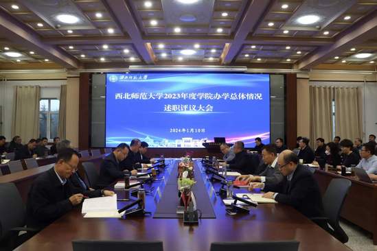 110日上午,西北师大2023年学院办学总体情况述职评议会召开。党委书记贾宁作分析点评,校长、党委副书记王占仁作总结讲话,校领导刘玉泉、田澍、马庆、李建民、李文生、张明军、王文昇、赵鑫对所联系学院2023年工作进行逐一点评。各学院、各单位、机关各部门负责人参加。