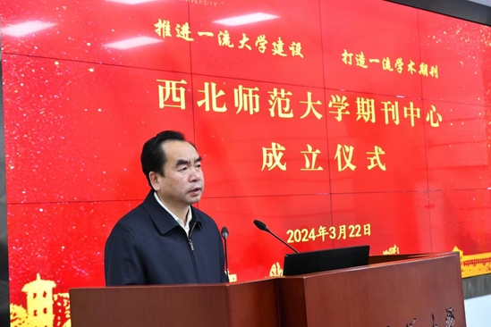 邵志刚在致辞中表示,西北师大期刊中心的成立,对于全省学术期刊建设、科学研究和文化发展工作具有重要意义,将为凝聚合力、打造优秀学术期刊矩阵奠定坚实基础。希望学校提高站位,坚持正确的政治方向和价值取向,坚持以习近平新时代中国特色社会主义思想为指导,深入贯彻落实习近平文化思想,为构建中国特色、中国风格、中国气派的学科体系、学术体系和话语体系贡献力量。要立足国情省情,深刻回答好重大理论与现实问题,用高质量的选题和优秀的学术成果解答时代之问,多提睿智之言、多献管用之策。要强化标杆意识,以“走在前、勇争先、善作为”的标准和要求,引领激励学术工作者勇攀高峰、多出成果,出好成果。要完善制度建设,守好意识形态前沿阵地,切实履行好新时代新的文化使命,为全省学术期刊事业的蓬勃发展贡献力量。