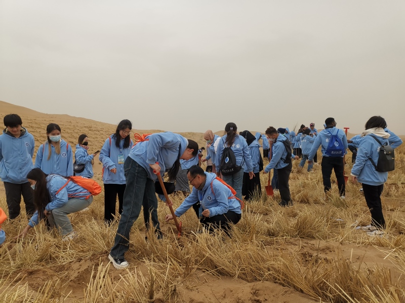在治沙点,大家纷纷拿起工具开展压沙植树活动,挖沟槽,铺稻草,压出了一块块草方格,种下了一棵棵梭梭苗,劳动场面热火朝天。兰州大学越南留学生武式琼庄表示,在《中国概况》课堂上,老师讲过愚公移山的成语故事,我感觉这里几代人治沙的过程,和愚公移山不怕困难的精神是一样的,这种克服困难改善环境的精神是非常值得学习的。