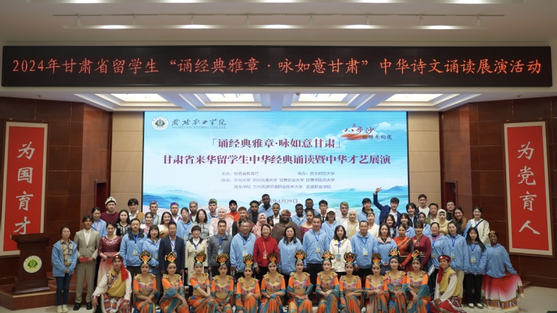 29日,在武威职业学院,各高校留学生还开展了“诵经典雅章·咏如意甘肃”为主题的中华诗文诵读展演活动。留学生在《将进酒》《读中国》《相信未来》《黄河落日》《生如胡杨》等经典雅章诵读中,以及《玛尼情歌》《我把甘肃唱给你》《美丽的神话》等民族歌舞展演中,充分交流中国文化学习成果和中国国情教育成果,切身感受中国优秀传统文化魅力。展演结束后,留学生们观看了武威职业学院学生表演的非物质文化遗产《西凉乐舞》《攻鼓子》展示。