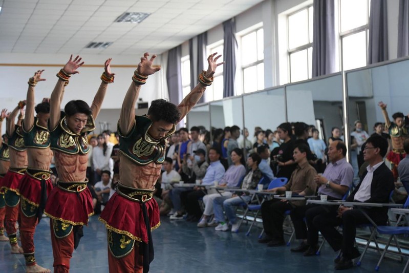 讲座结束后,黄豆豆还现场观看了敦煌舞表演,并对学生进行了指导。黄豆豆表示,通过舞蹈展示,他深切体会到了西北师大在敦煌艺术传承创新上的突出成就,看到了敦煌学院舞蹈专业在训练与剧目上的思考,又在风格和文化属性上找到了敦煌学院的特点。他指出,西北师大敦煌学院应深挖敦煌舞蹈的历史传承于艺术特点,在课堂教学与剧目呈现上下真功夫、作真文章,使舞蹈作品不仅在视觉传达上达到最佳效果,更在艺术表达上体现深厚特色与人民立场。他希望,西北师大师生要重视舞台角色的人物关系与动作质感的紧密衔接,从角色出发、从舞蹈表演与自己的关系出发,同千年传承的文明和个体渺小的生命之间进行对话,让每一个观众都能体会到敦煌文化的博大精深。