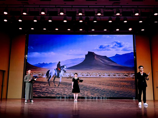 诗朗诵环节选取了著名诗人昌耀的《在敦煌名胜地听驼铃寻唐梦》、叶舟的《大唐西域记》、汪小平的《兰州、别样的城市》以及项目主持人徐兆寿的《寻找昆仑》《敦煌之光》等。学员们以诗歌朗诵的形式,抒发了诗人对丝绸之路的赞美之情,展现了丝绸之路的壮丽景色和丰厚的历史文化内涵,仿佛令人置身于充满传奇色彩的古道。最后,全体学员与舞蹈演员合唱歌曲《等你在凉州》,将演出推向了高潮。