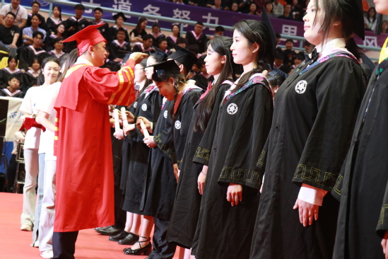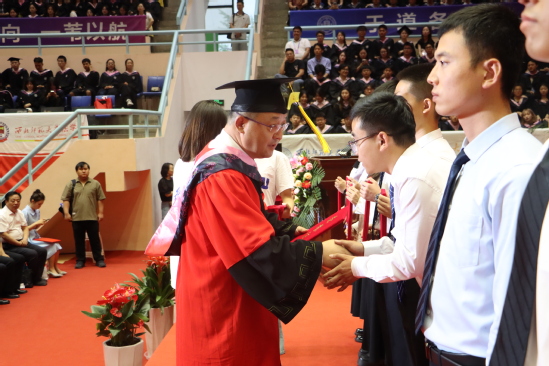 校领导、学位委员会成员在毕业生的欢呼呐喊声中步入会场并在主席台就座。