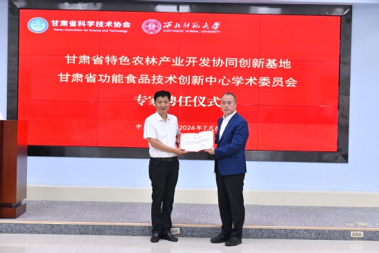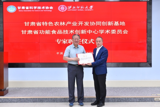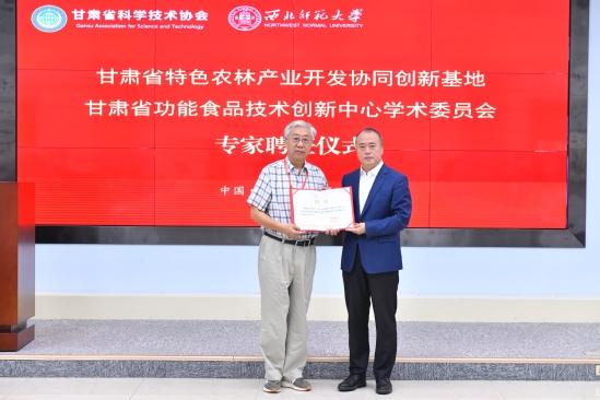 西北师大校长王占仁为院士、专家颁发了甘肃特色农林产业开发协同创新基地和甘肃省功能食品技术创新中心咨询专家委员会委员聘书。