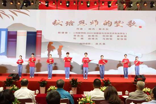 学生代表为全体教师献上原创诗朗诵《献给恩师的赞歌》。