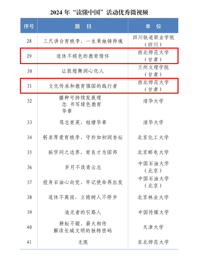 近日,教育部关心下一代工作委员会印发《教育部关工委关于公布2024年“读懂中国”活动入选作品名单的通知》。西北师大报送的征文作品《躬身杏坛育人才,立根西北赤子心》《追光者》入选最佳征文,微视频作品《退休不褪色的教育情怀》《文化传承和教育强国的践行者》入选优秀微视频。学校关工委获得通报表扬。