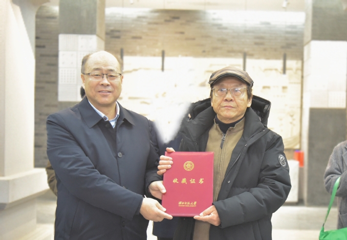 开幕式上,王亚民遵照母亲遗愿捐赠了王天一先生本次展出的44幅课徒画稿,副校长王文昇为王亚民颁发收藏证书。