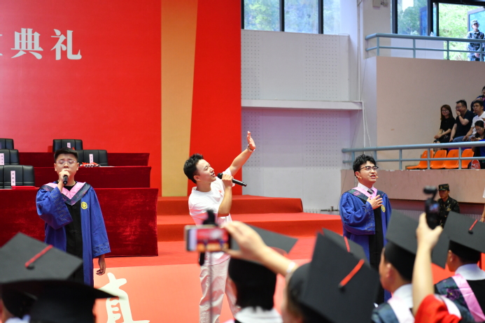 典礼开始前,学生代表献歌母校,在青春的旋律中,“快闪”演出瞬间点燃现场氛围,拉开了毕业典礼的序幕。